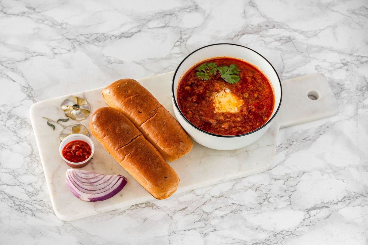 India's iconic street burger featuring a spiced potato fritter (vada) tucked inside a soft pav bun, served with chutneys and fried green chili.